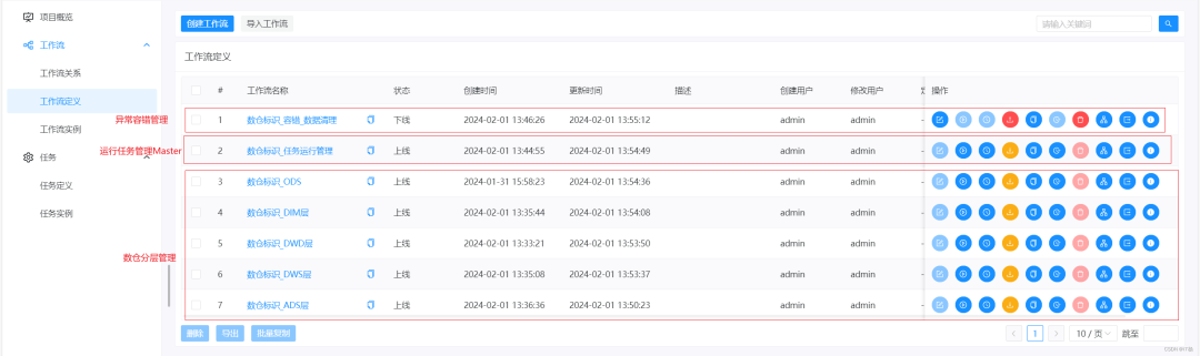 数仓分层工作流:ODS、DIM、DW、ADS每层一个工作流;DW层可以根据业务需求,细分出三个DWD、DWM、DWS等好实现业务需求的单独任务流管理;