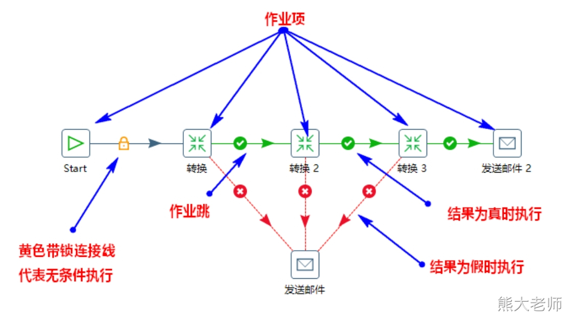 一个作业包括一个或多个作业项,这些作业项以某种顺序来执行。作业执行顺序由作业项之间的跳和每个作业项的执行结果来决定。 可以单机作业跳来改变作业跳的状态,有三种状态(锁-必须执行、对号-执行成功时、错号-执行失败时,这三种状态可以通过单击连线进行切换)。