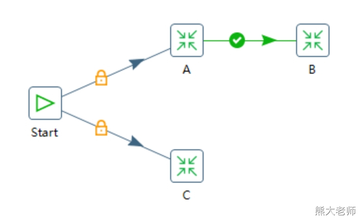 首先“开始”作业项搜索所有下一个节点作业项,找到了“A”和“C”