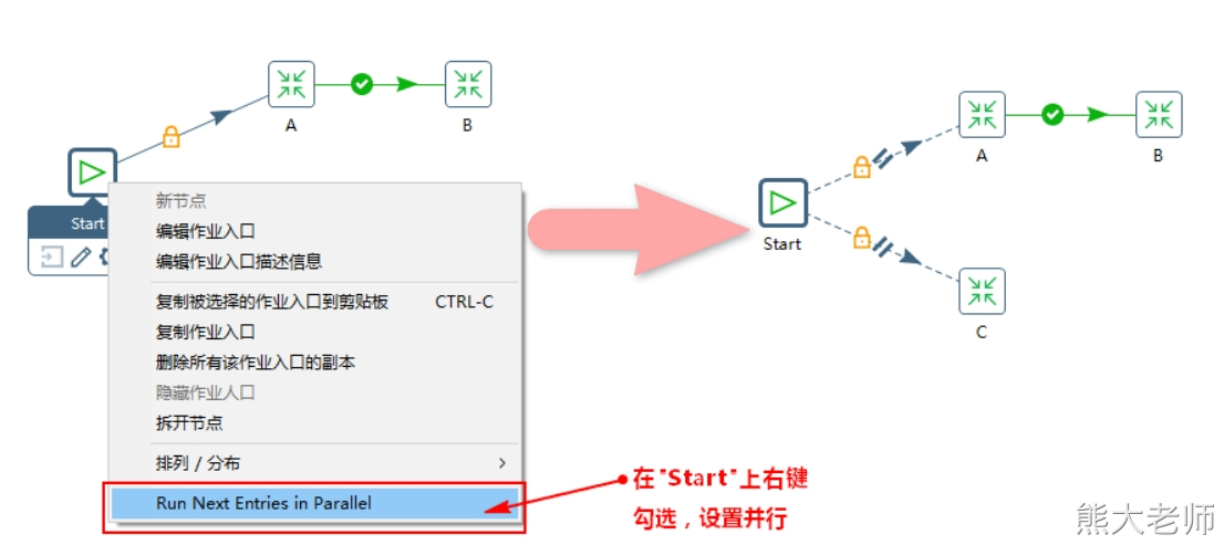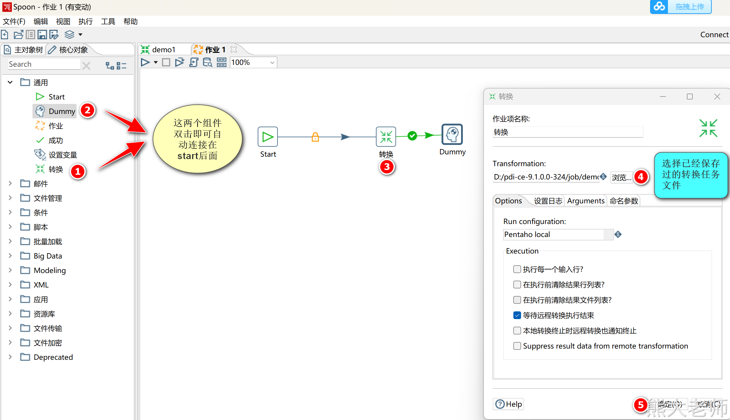 “Transformation-转换”里的步骤几乎是同时启动的,所以不可能判断出哪个步骤是第一个启动的步骤。如果想要一个任务沿着指定的顺序执行,那么就要使用“Job-作业”。