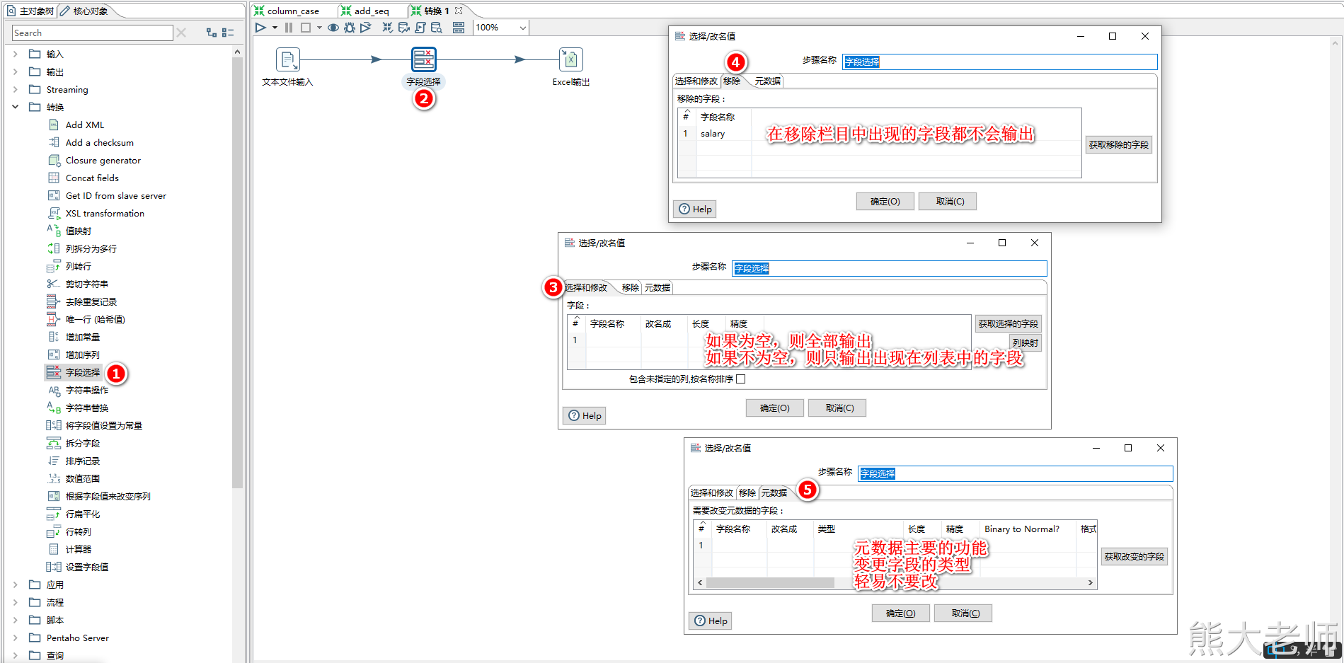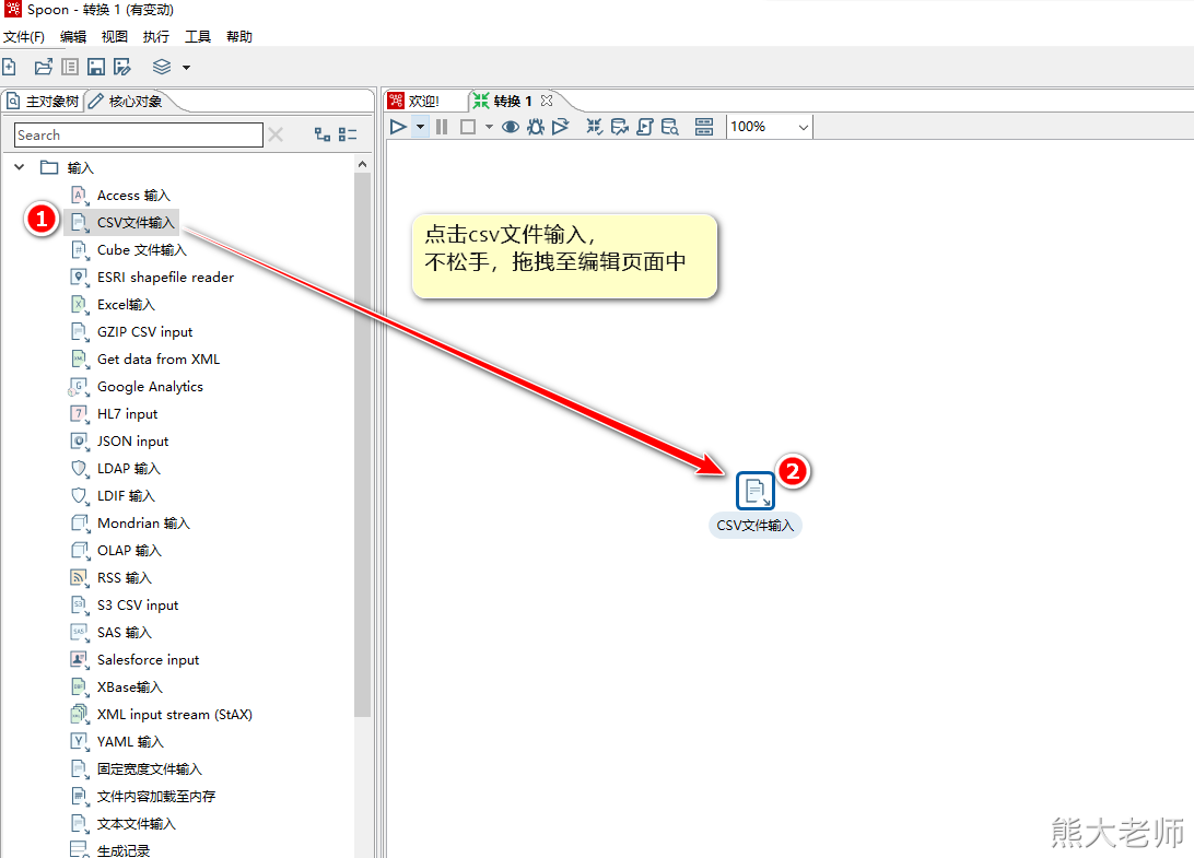 | spoon | 【勺子】是kettle的图形化工具,可以通过简单的拖拉拽方式完成kettle任务的设计、运行与调试,为kettle最常用的组件。 |