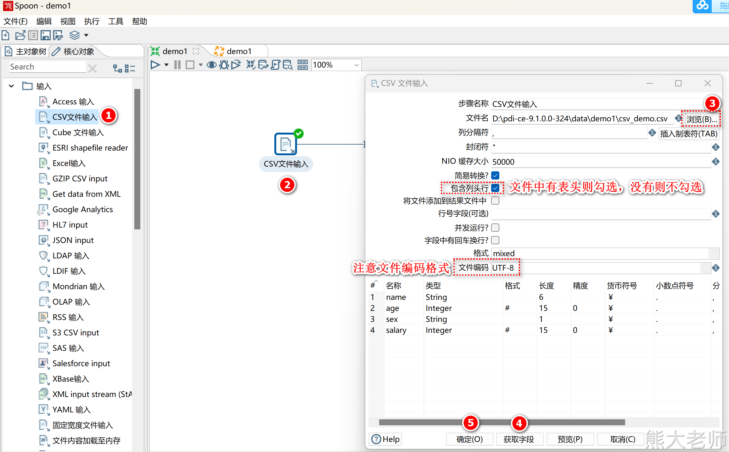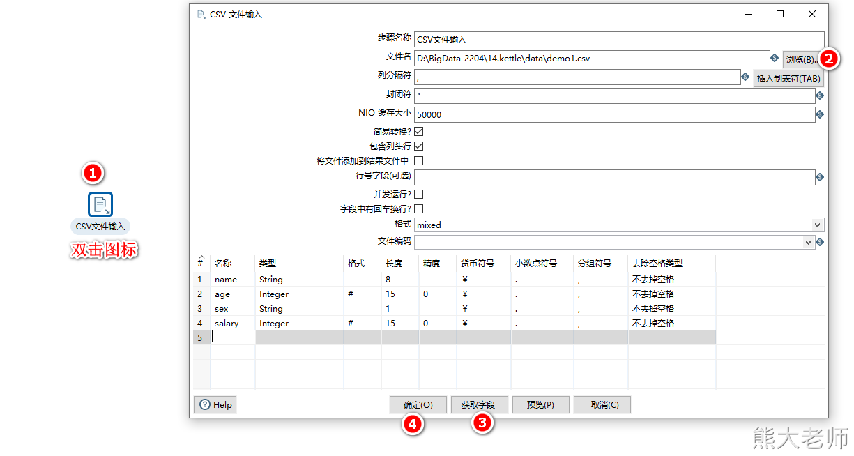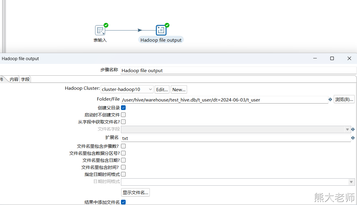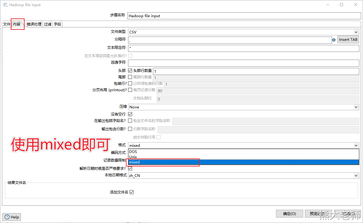 注意:在抽取hdfs文件的时候,如果点击【获取字段】出现报错,需要变更文件的格式,具体如下: