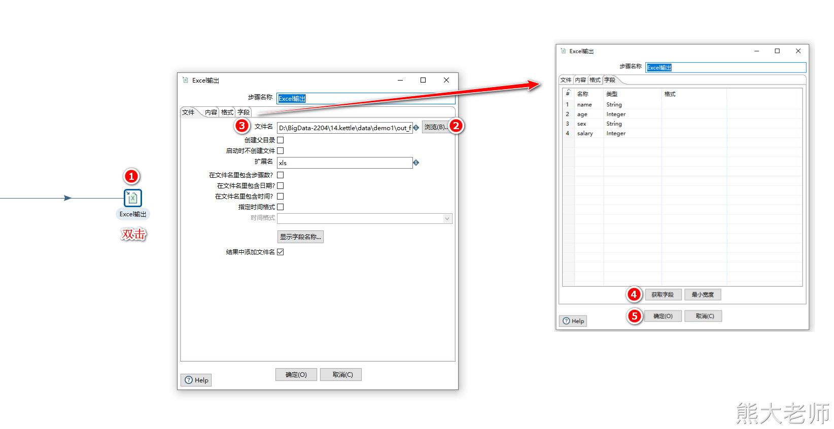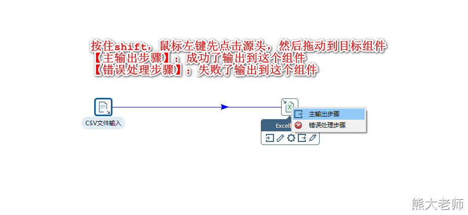 “CSV文件输入”和“Excel输出”显示了两个Step步骤。