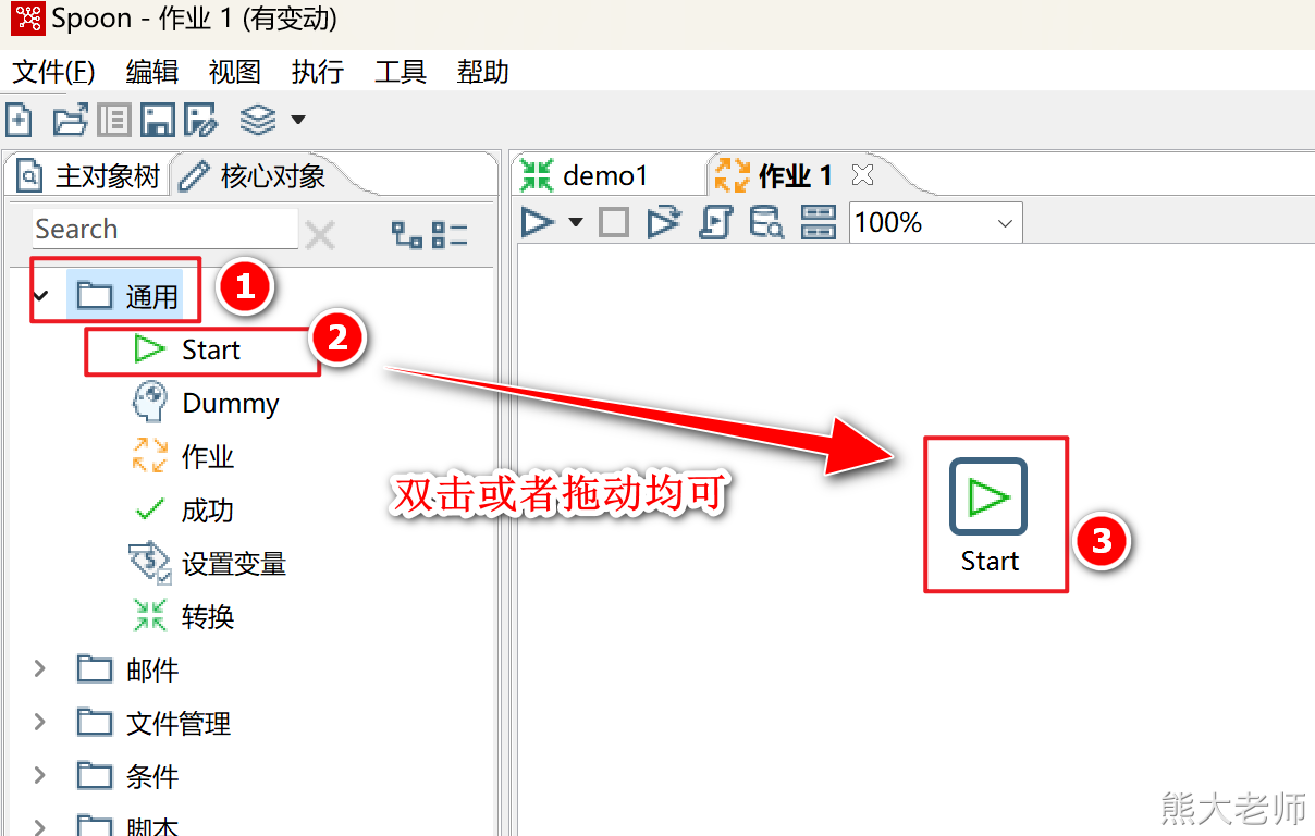 上图中的“Start”是“job-作业”的起点,一个作业只能定义一个“Start”。上图中每个“转换”就是作业的作业项,作业项是作业的基本构成部分。默认情况下作业中作业项都是以串行的方式制定,只是在特殊的情况下以并行方式执行。