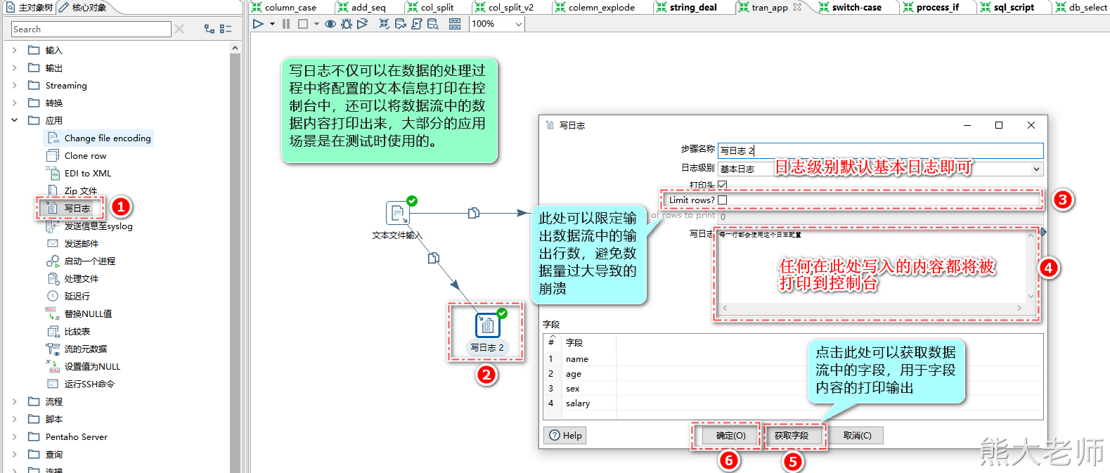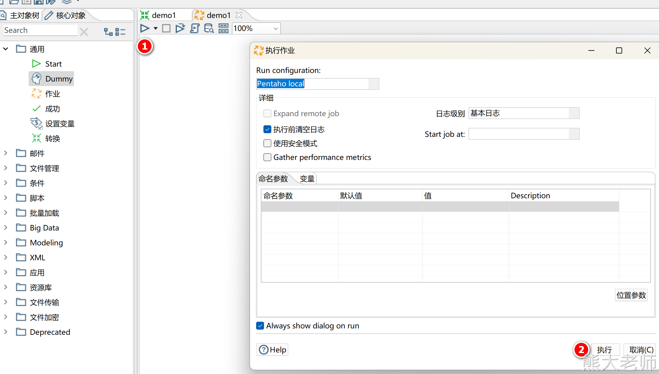 注意:在启动任务时,会出现启动配置,此时,启动配置中的日志级别需要大于等于任务中【写日志】step中配置的日志级别。