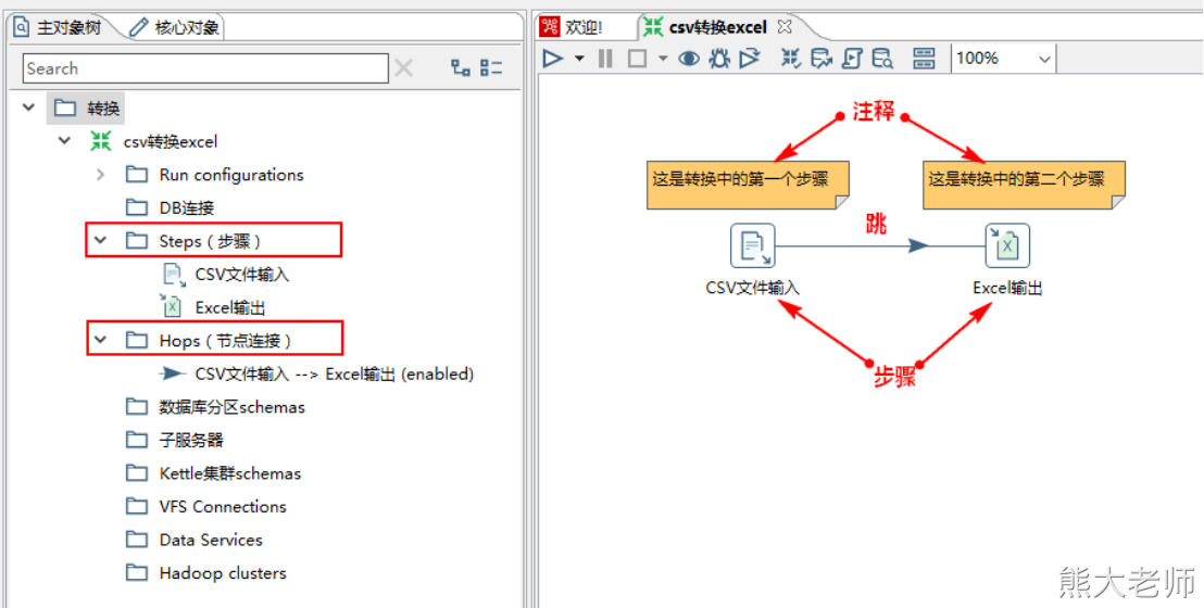 转换(transformation)是ETL解决方案中最主要的部分,它处理抽取、转换、加载各阶段各种对数据的操作。转换包含一个或多个“Step-步骤”,例如读取文件,过滤数据,数据加载等操作都是步骤。转换里的步骤通过“Hop-跳”来连接,跳定义了一个单向通道,允许数据从一个步骤向另一个步骤流动。此外,转换中的每个步骤还可以注释,目的主要是使转换文档化。