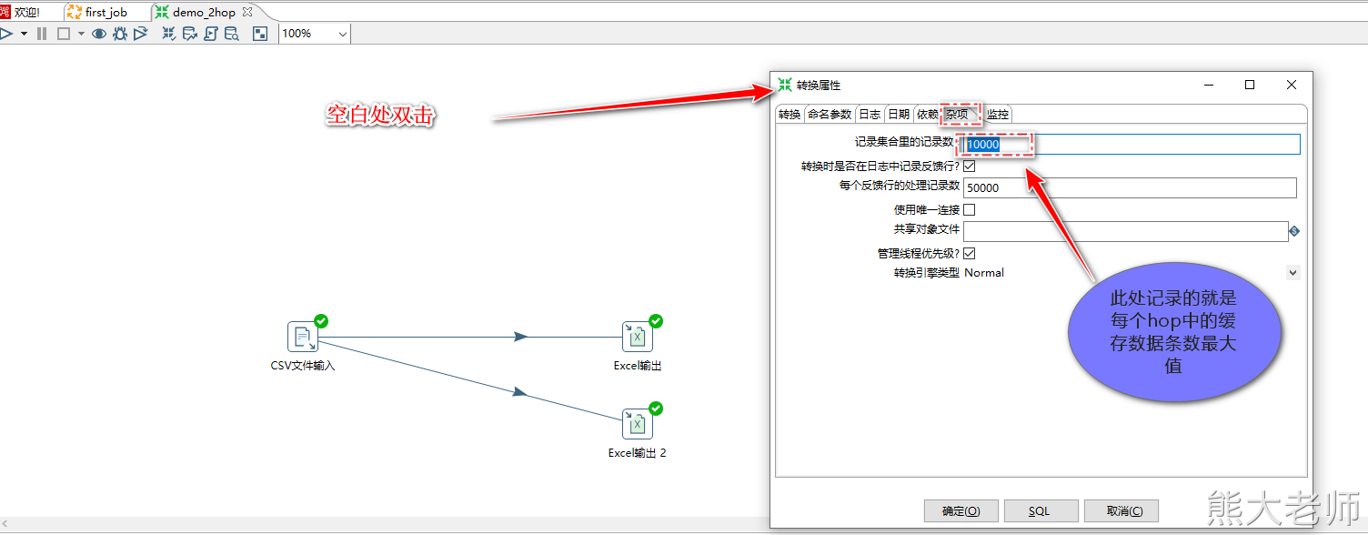 “Hop-跳”实际上是两个“Step-步骤”之间的记录行的缓存,缓存数据量可以在转换配置中设置(双击配置页面空白处),当缓存记录数满了,写数据的步骤停止写入,此时输出步骤不会停止,持续的读取缓存数据,直到缓存中有空间,写数据步骤继续运行。当缓存清空后,读取数据的步骤停止读取数据,直到缓存中又有数据。