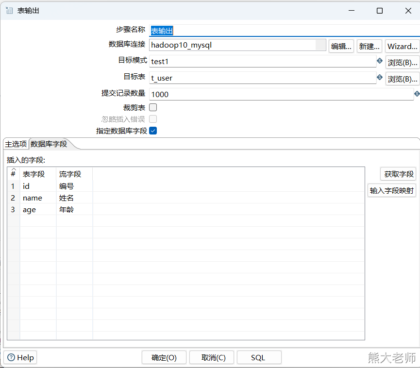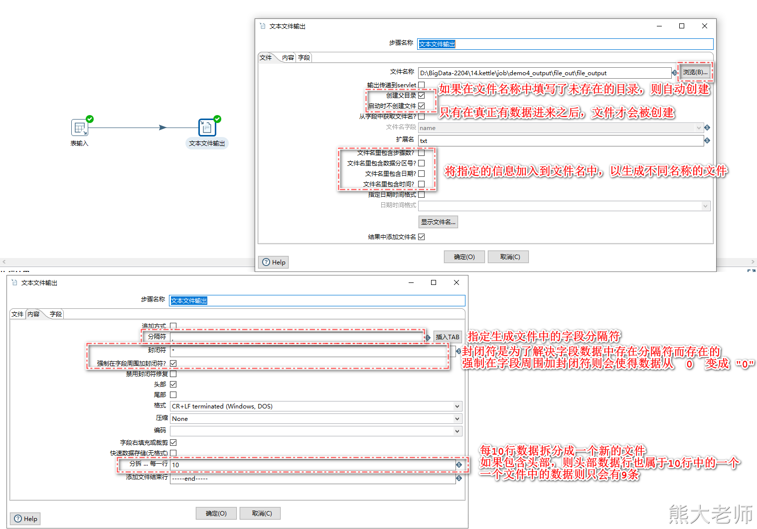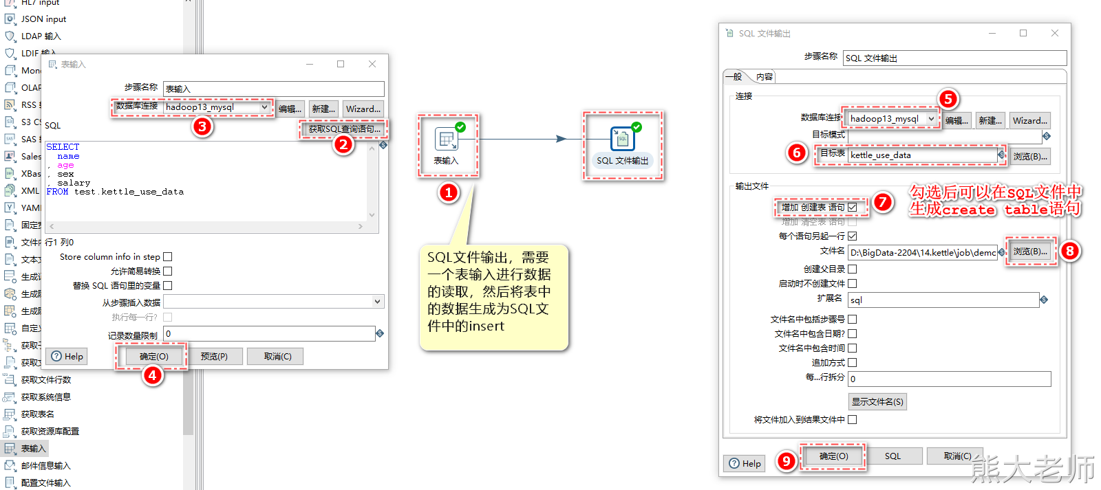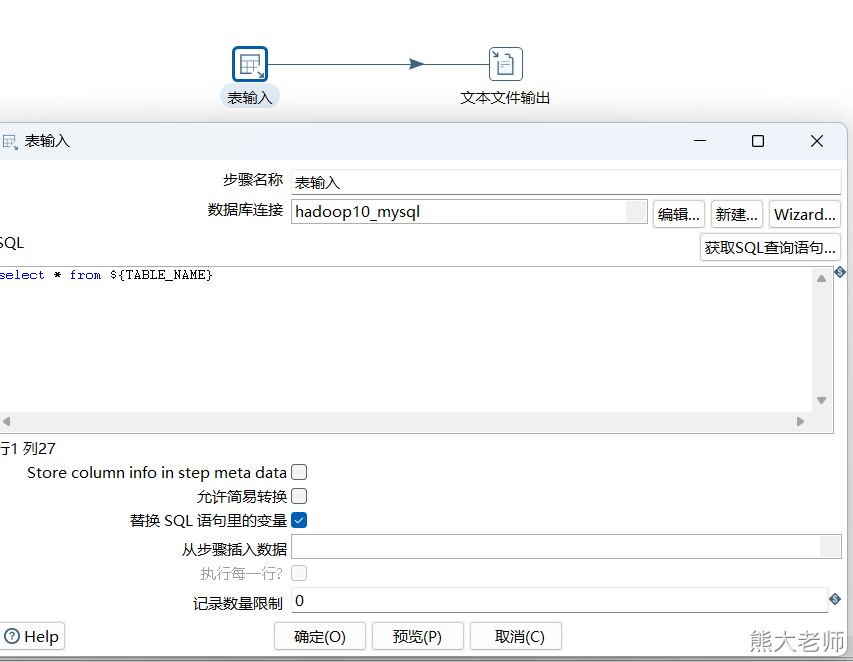 - 循环过程:每次从数组中获取一个表名,将这个表名放入两个地方,分别是表输入中的from后面的表名,与文本文件输出中的文件名。