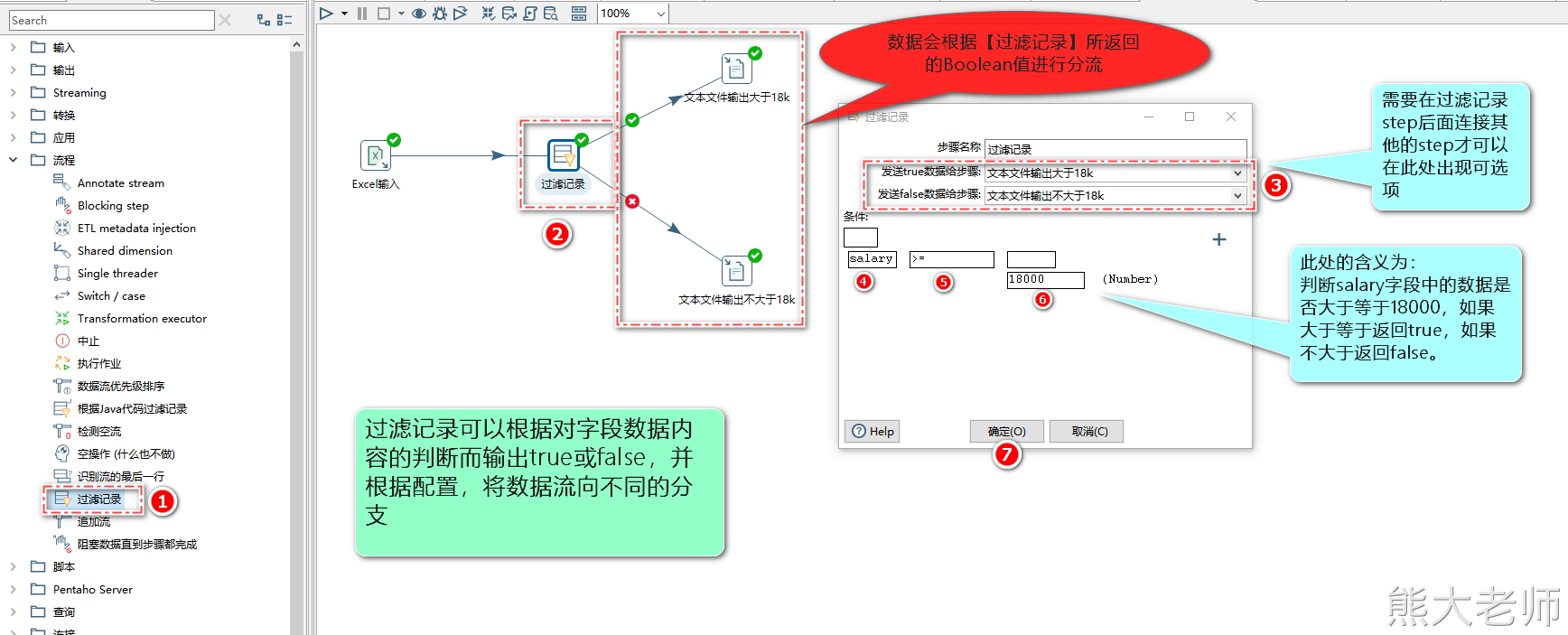 “过滤记录”可以根据指定条件获取true或者false让数据流数据由一路到两路
