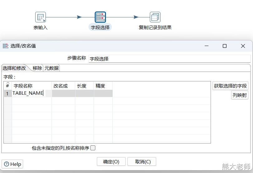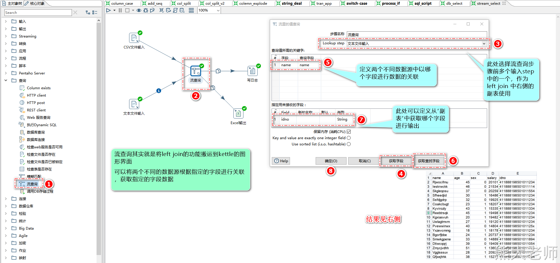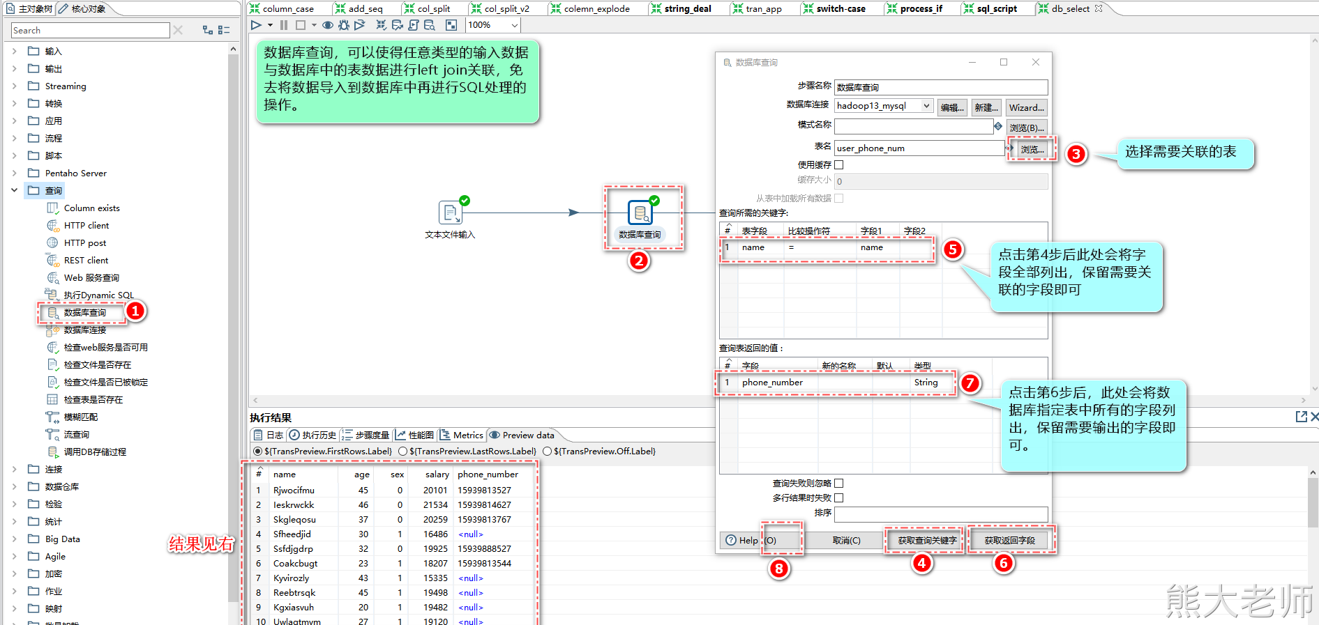 当在处理一个文本文件或者Excel文件的时候,需要去关联数据库中的数据,将数据库中的数据(字段)关联出来,作为输出,可以使用【数据库查询】step