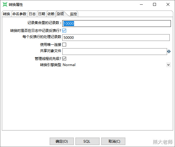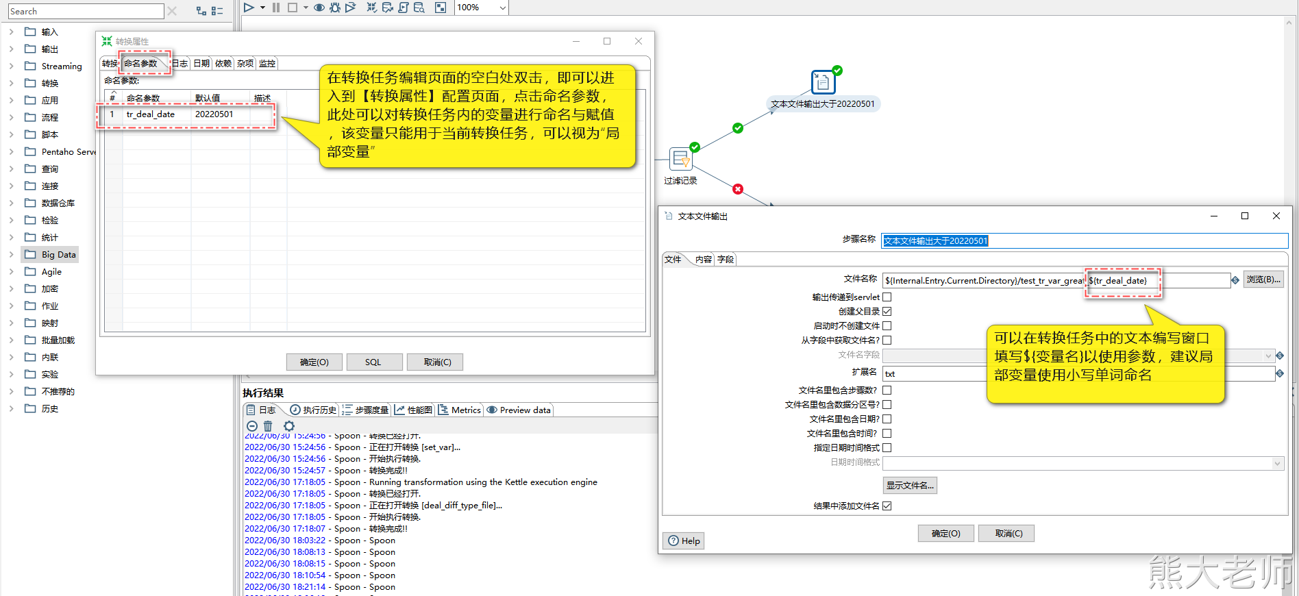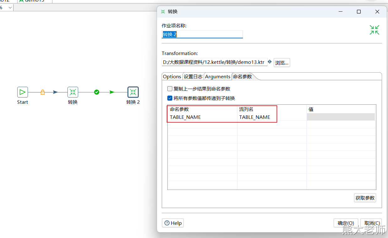 转换命名参数就是在转换的内部定义变量,作用范围在转换的内部,相当于是局部参数。设置转换命名参数可以在转换空白处双击打开“转换属性”->“命名参数”进行设置