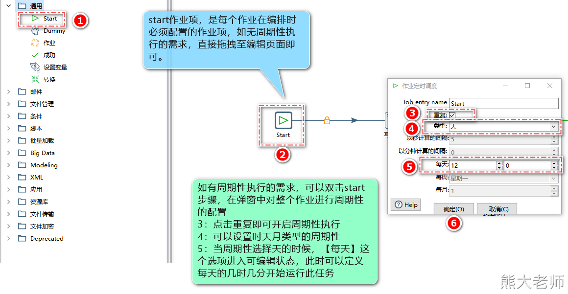 “Start”是定义作业的起点,一个作业只能有一个开始作业项。在start组件中,可以定义启动周期与定时启动。