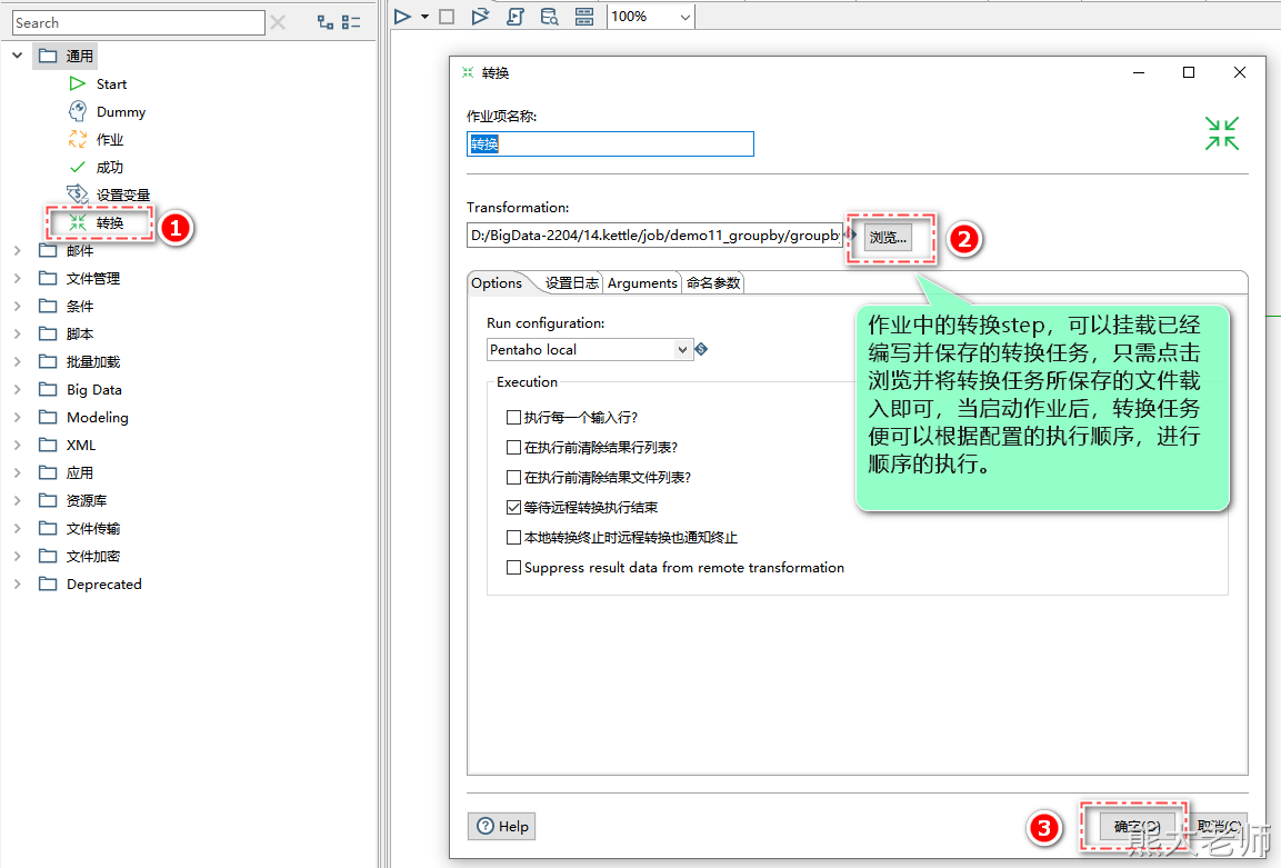 “转换”作业项可以包含一个转换,我们可以将详细的操作过程存入一个转换,然后包含到一个“转换”作业项中。