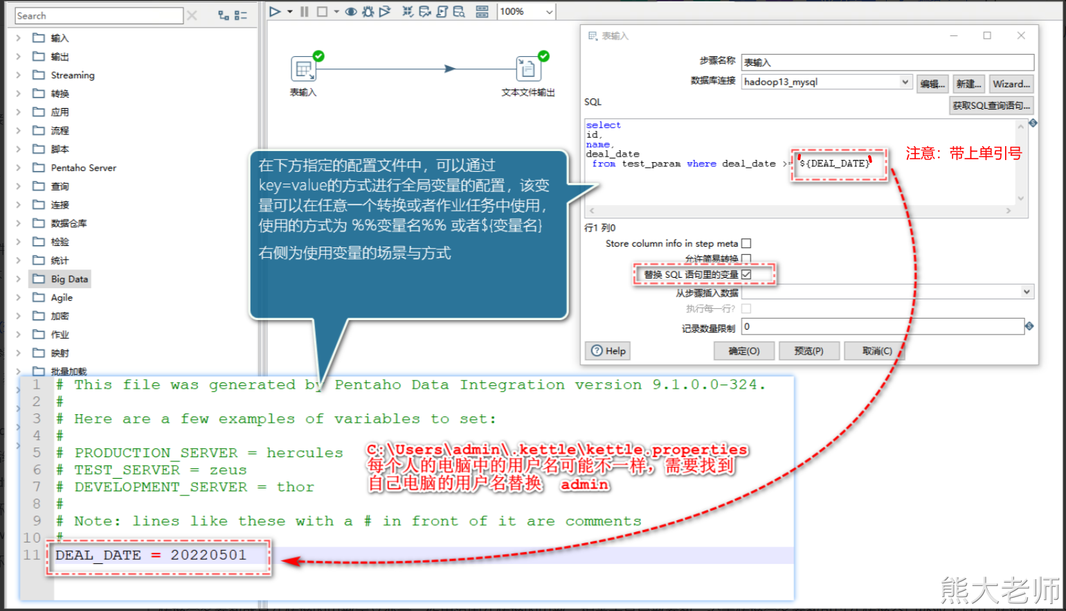 全局参数定义是通过当前用户下.kettle目录中的kettle.properties文件来定义的,定义方式使用Key=Value方式,例如:ID=1。注意:在定义配置全局参数后需要重启Kettle才会生效。定义好的全局参数在任何转换和作业中可以直接使用。使用参数有两种方式:“%%变量名%%”和“${变量名}”。