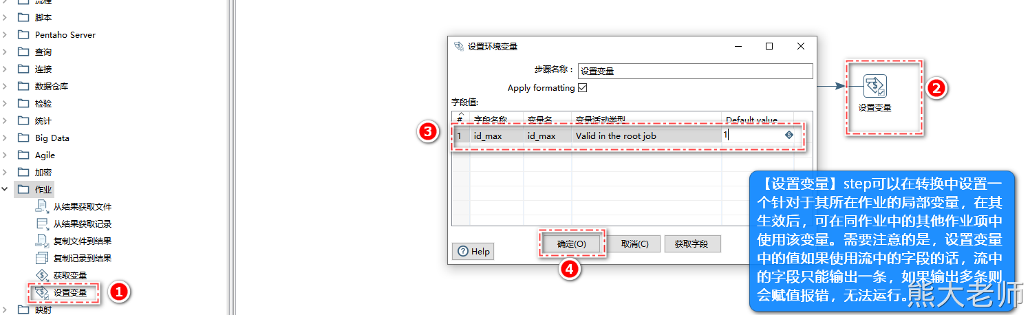 在转换中有“作业”分类,在里面有“设置变量”和“获取变量”的步骤,“设置变量”可以定义一些值,这些值不能在当前转换中使用,需要在下一个转换中使用,在下一个转换中通过“获取变量”来使用。