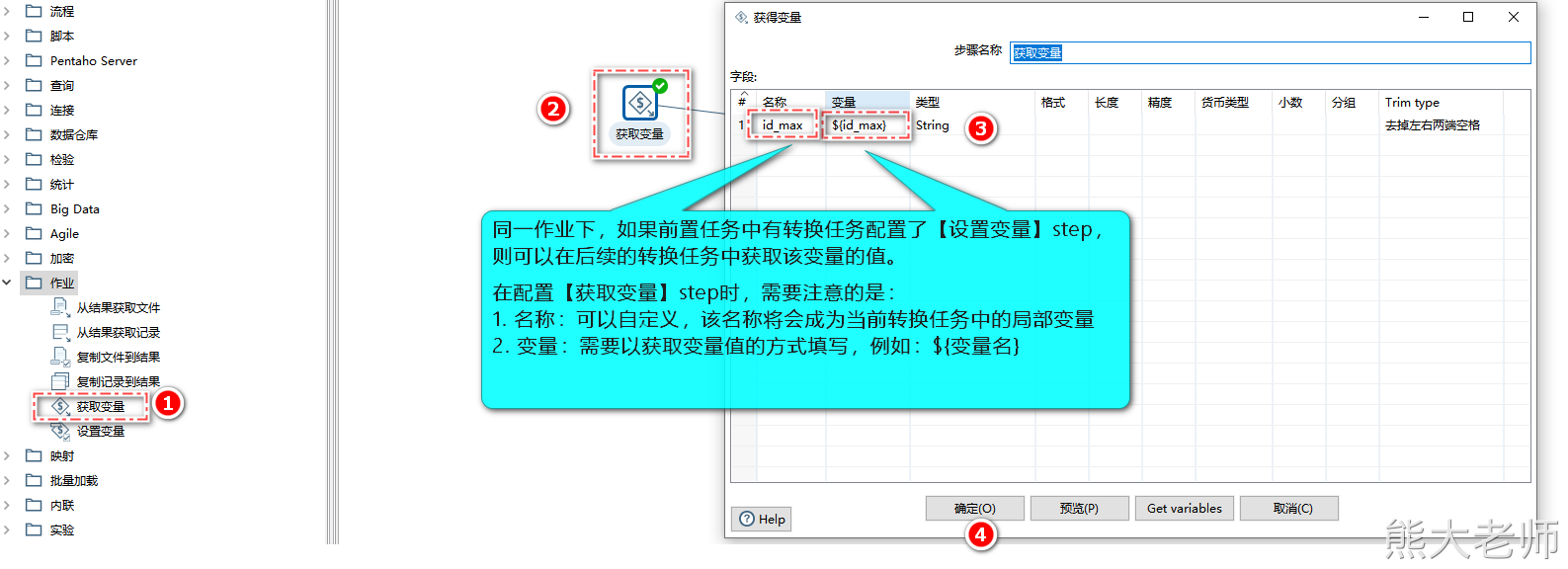- 实现:在抽取完第一台服务器中mysql的表数据后,通过分组获取数据ID的最大值,并通过【设置变量】进行变量的设置,新建一个转换任务,在转换中使用【获取变量】对上一步转换设置的变量进行获取,然后将新增的局部变量放入SQL条件中(ID > ${最大值变量}),用来完成数据的范围限定,从而保证数据的不重复。